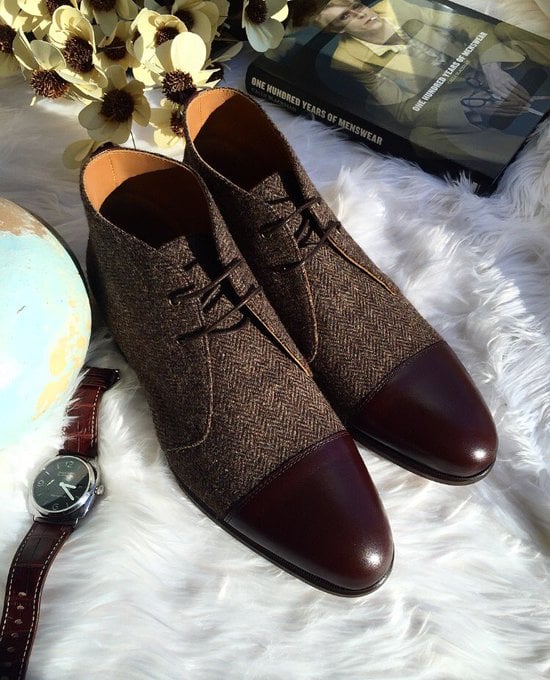 Top Fashion Men's Hand Stitch Two Tone Leather Tweed Lace Up Chukka Boot