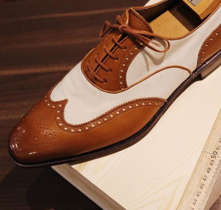 Classic Men's Hand Stitch Brown White Contrast Shoes, Oxfords Wingtip Lace Up Leather Shoes