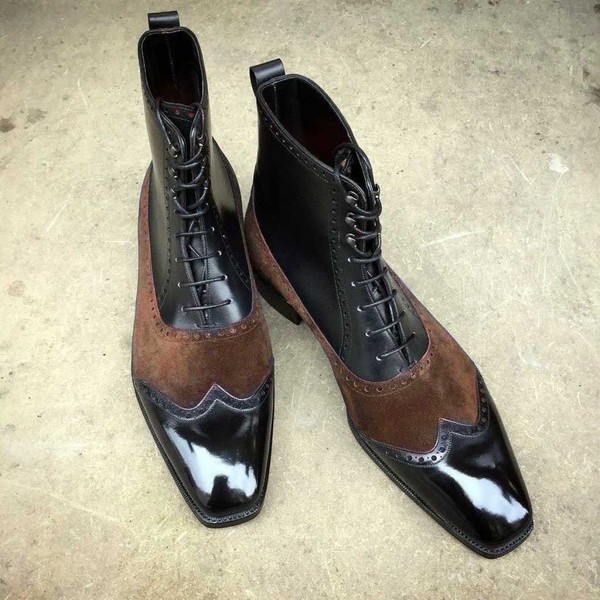 Men Black Leather Brown Suede Decent Wingtip Ankle High Boot, Men Oxfords Formal Boot