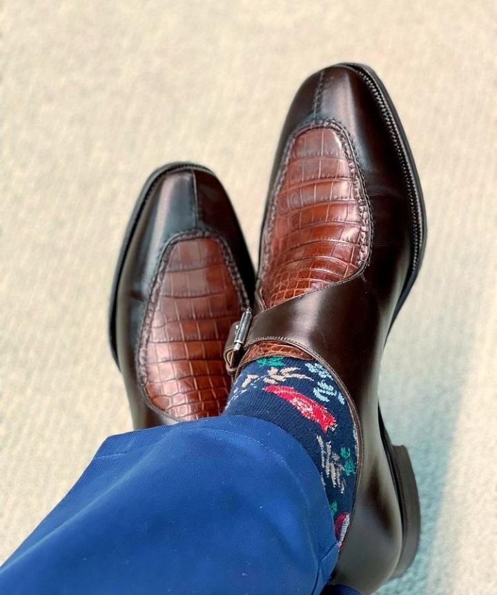 Men Luxury Brown Crocodile Contrast Leather Monk Shoes