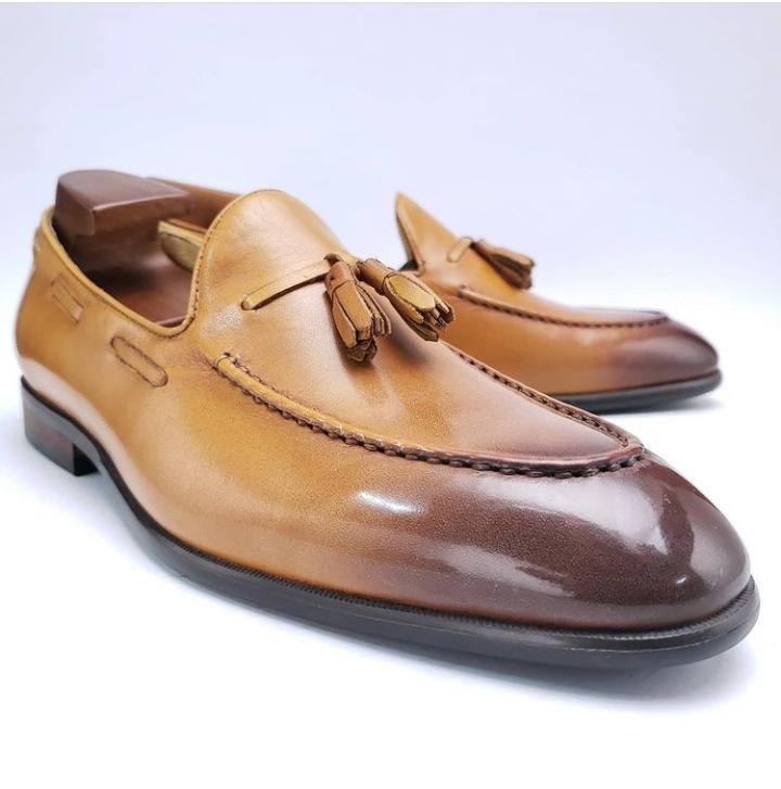 Trendy Hand Stitch Two Tone Leather Shoes, Men's Tassels Loafer Shoes