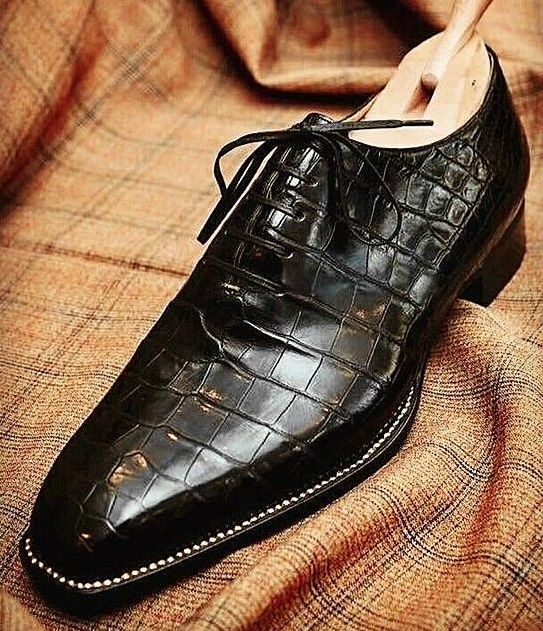 Mens Luxerious Black Leather Crocodile Skin Handmade Lace Up Formal Dress Shoes