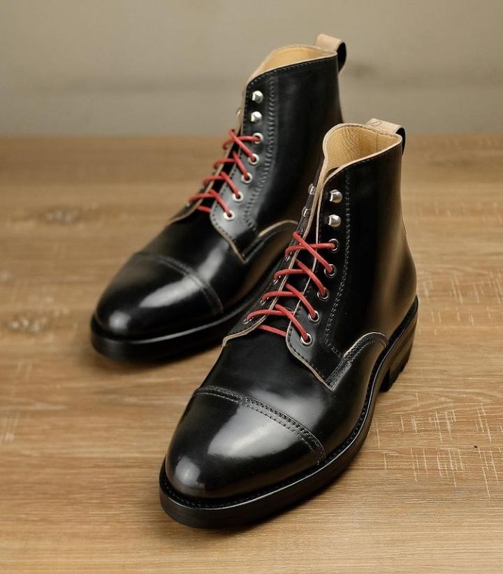 Trendy Black Leather Ankle High Boot, Handmade Cap Toe Lace Up Military Boot