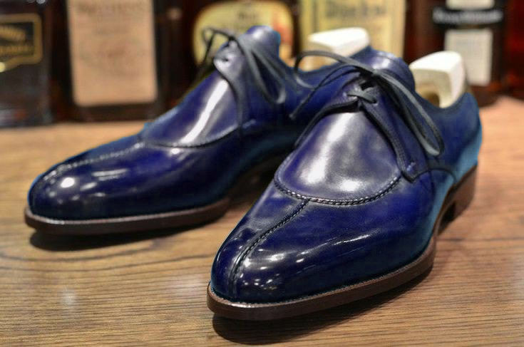 HANDMADE MEN NAVY BLUE LEATHER SPLIT TOE DECENT LACE UP FORMAL SHOES