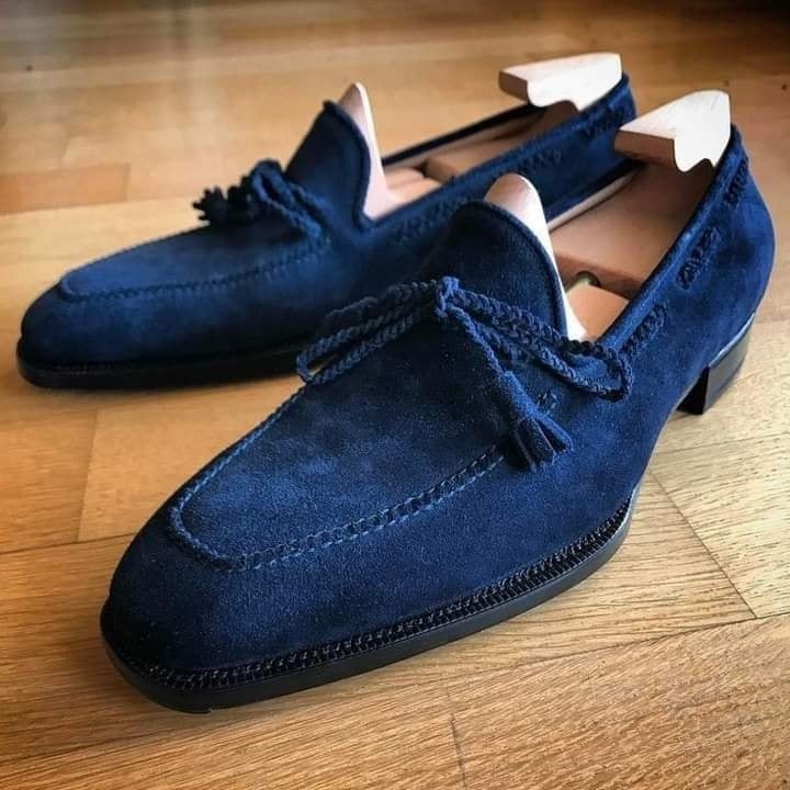 Handmade Men's Navy Blue Tassels Moccasin Shoes, Suede Formal Wear Shoes