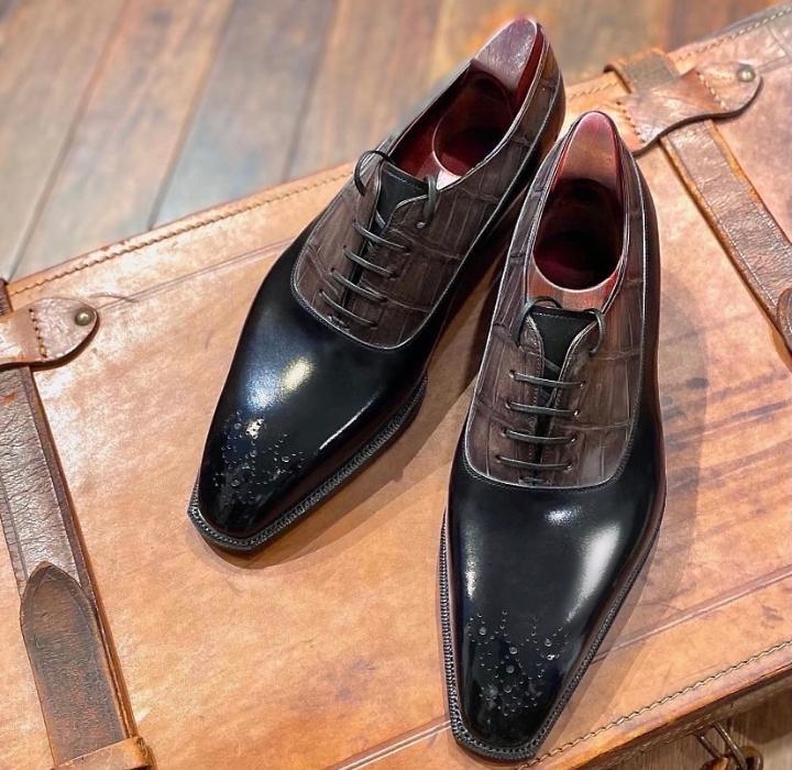 Luxury Men's Brown Black Tone Alligator Skin Shoes, Brogue Lace Up Leather Shoes