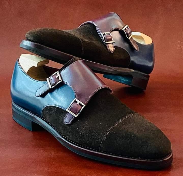 Elegant Handmade Black Leather Suede Double Monk Strap Shoes For Men's