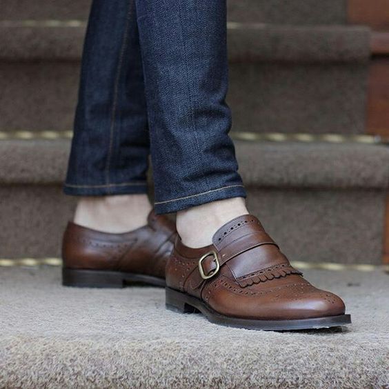 Best Fashion Hand Stitch Dark Brown Fringe Monk Shoes, Genuine Leather Christmas Shoes