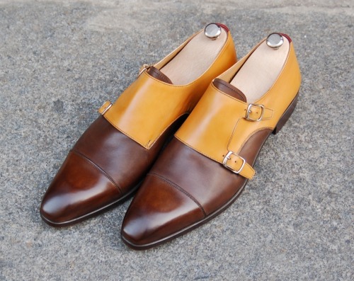 Men's Handmade Brown With Tan Leather Double Monk Fashion Dress Shoes