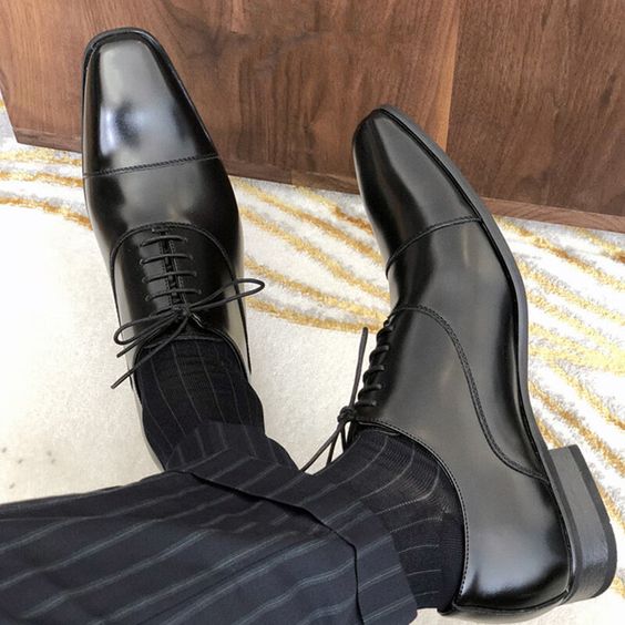 Black Cap Toe Handmade Dress Lace Up Shoes